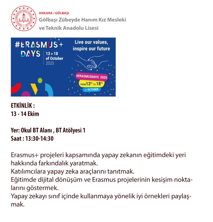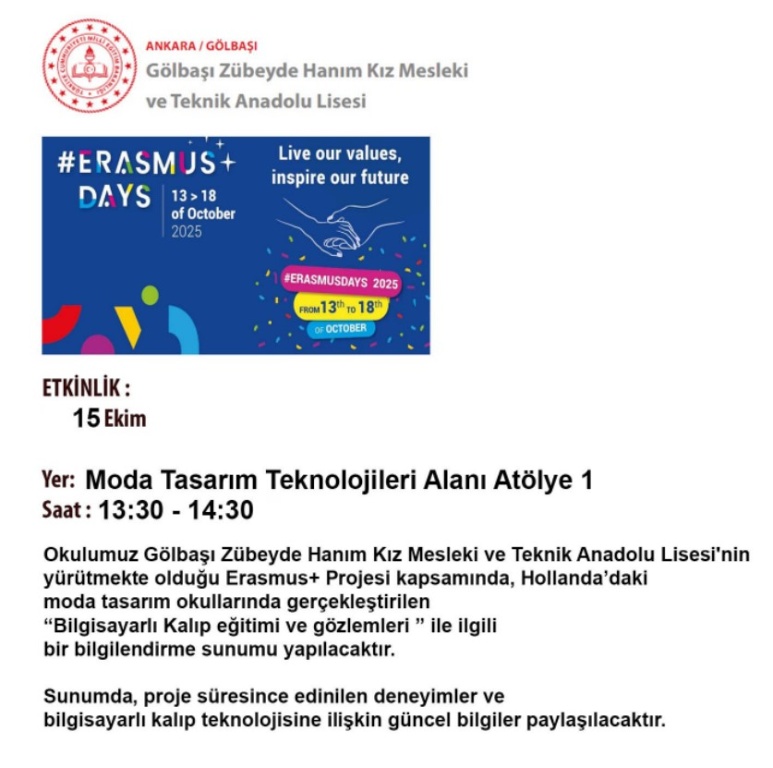 2025 yılında biz de Gölbaşı Zübeyde Hanım Kız Mesleki ve Teknik Anadolu Lisesi olarak bu coşkuya katılıyor, Avrupa’yı sınıflarımıza taşıyoruz